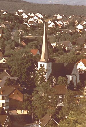 Ferndorf ist nicht nur der älteste Stadtteil der noch relativ jungen Stadt Kreuztal am Fuße des Kindelsberges. Ferndorf ist auch der älteste Ort im alten Landkreis Siegen. Urkundlich erstmals im Jahre 1067 als Berentraph geschichtlich zu Tage getreten hat Ferndorf bis heute den Charakter eines Dorfes behalten. Wurde der Ort in der Vergangenheit durch Bergleute, Hammer-schmiede und bäuerliche Anwesen geprägt, sind es heute die Großindustrie und der Mittelstand, die sich in Ferndorf zu Hause fühlen. Einige landwirtschaftliche Erzeuger sind noch anzutreffen jedoch geht auch hier der Bestand zurück. Der markanteste Punkt in Ferndorf ist ohne Zweifel die ev. Kirche. Erbaut etwa um 1200 überragt sie mit ihrem imposanten Spitzturm das gesamte Dorf. Bestandteil der dörflichen Prägung gliedert sich vor allem im Vereinswesen. Hier sind der Turnverein, mit seiner Handballabteilung der über die Grenzen des Siegerlandes hinaus bekannt ist, Heimatverein und SGV an führender Stelle zu nennen. Die SGV Abteilung Ferndorf - Kreuztal installierte im Jahre 2000 eine Wegetafel in der Ortsmitte, die sich optisch durch ihre Holzkonstruktion mit Schieferdach an die Umgebung anpaßt.